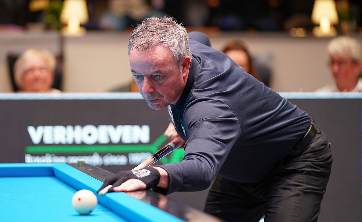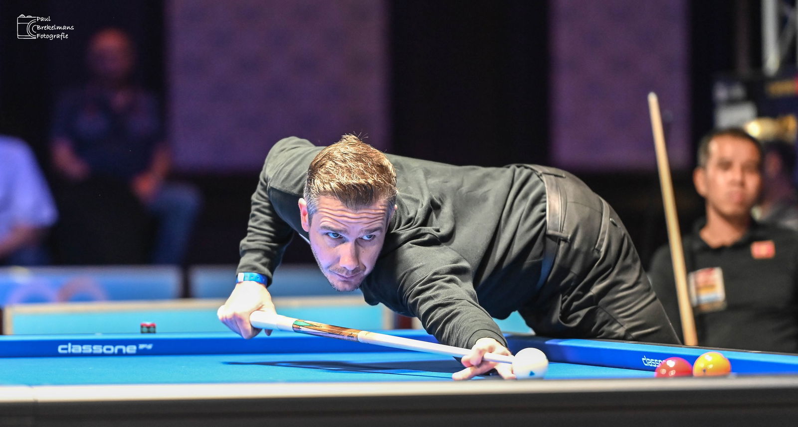 Wat een feilloze start heeft Peter Ceulemans, die in zijn eerste partij de jonge Koreaan Myung Woo Cho zowat van tafel veegt met 40-18 in 13. De Belg is op slag favoriet, heeft ook Jérémy Bury lang in zijn greep, maar ziet de Fransman plotseling ontsnappen met een curieuze finish. De spanning is terug. Drie spelers strijden om twee plaatsen in de laatste rondgang. Ceulemans is superieur tegen Kiraz, die ondanks een sterk eindschot niet meer ontsnapt aan de Belg (40-30 in 17). Bury en Cho vechten een bittere strijd uit. De kleine Koreaan speelt uit als Bury nog op 35 staat en gelijk moet winnen voor groepswinst. De Fransman toont zijn vechtersmentaliteit en zet de partij in balans (40-40 in 24), waardoor hij zelf doorgaat en Cho is uitgeschakeld.