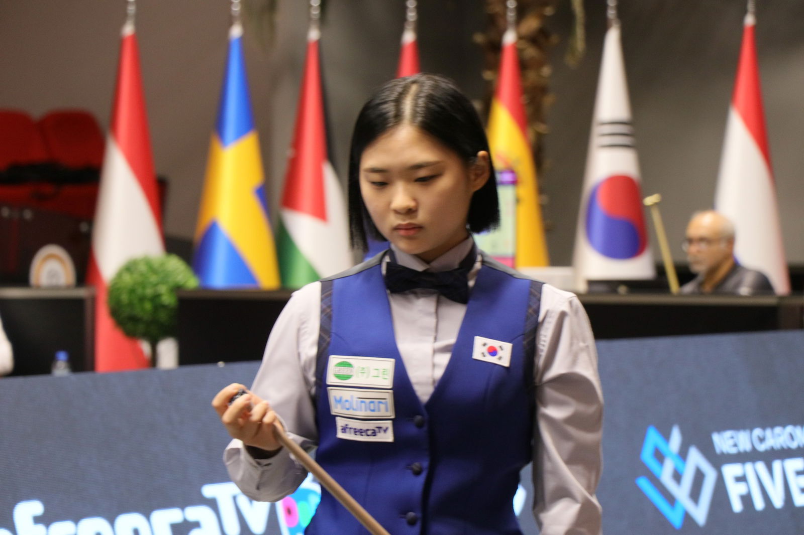 De jeugdige Koreaanse Ha Eun Kim werd tegen Andrea Cardona uit Colombia geremd door spanning, had een lange periode van 26 beurten met eentjes en nullen en kon uiteindelijk finishen met 30-23 in 46 beurten.