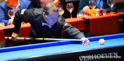 Frédéric Caudron, in topvorm de laatste twee weken, ging met negen van acquit tegen Frans van Kuyk, stond 28-13 voor na 11 beurten, maar zag die voorsprong verdwijnen, omdat de Nederlander eerst een serie van 13 gevolgd door vier maakte. Caudron was gewaarschuwd, herpakte zich snel en speelde knap uit met slotseries van 6-8-0-4-0-4. Wesley de Jaeger scoorde op de beslissende momenten en bedwong Martin Spoormans in de eerste sessie in 28 beurten. Gerwin Valentijn bracht zijn team langszij: de uitblinker in de Nederlandse competitie van zondag (40 in 10 beurten) had weer een vliegende start (31-14 in 14). Het werd uiteindelijk nog 45-37 en 49-47, waarna Valentijn uitspeelde met een geluksballetje. Door Caudron (met winst) en Guy van Litsenborg (winst tegen Jerry Hermans in 37 beurten) eindigde de wedstrijd in 4-4.