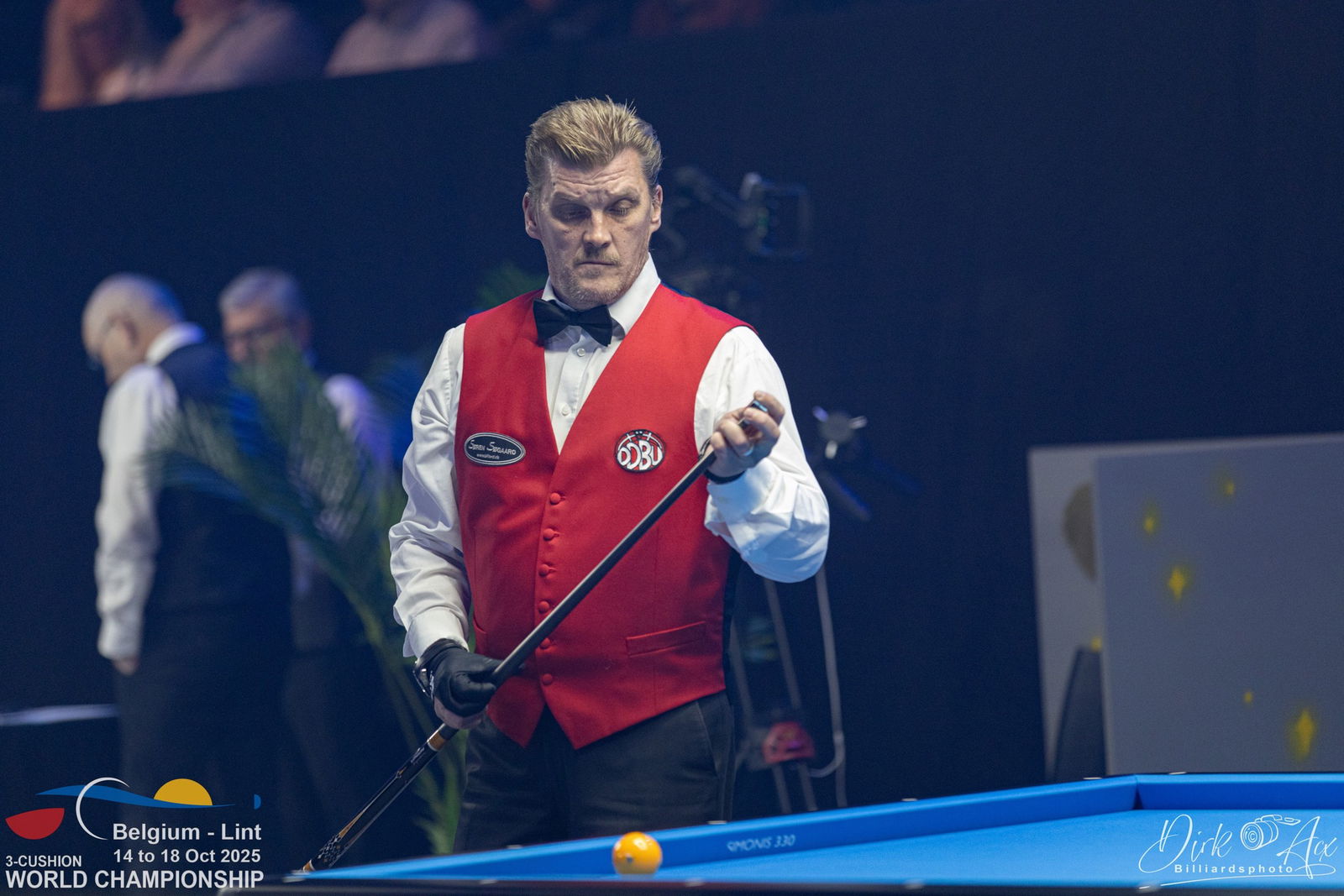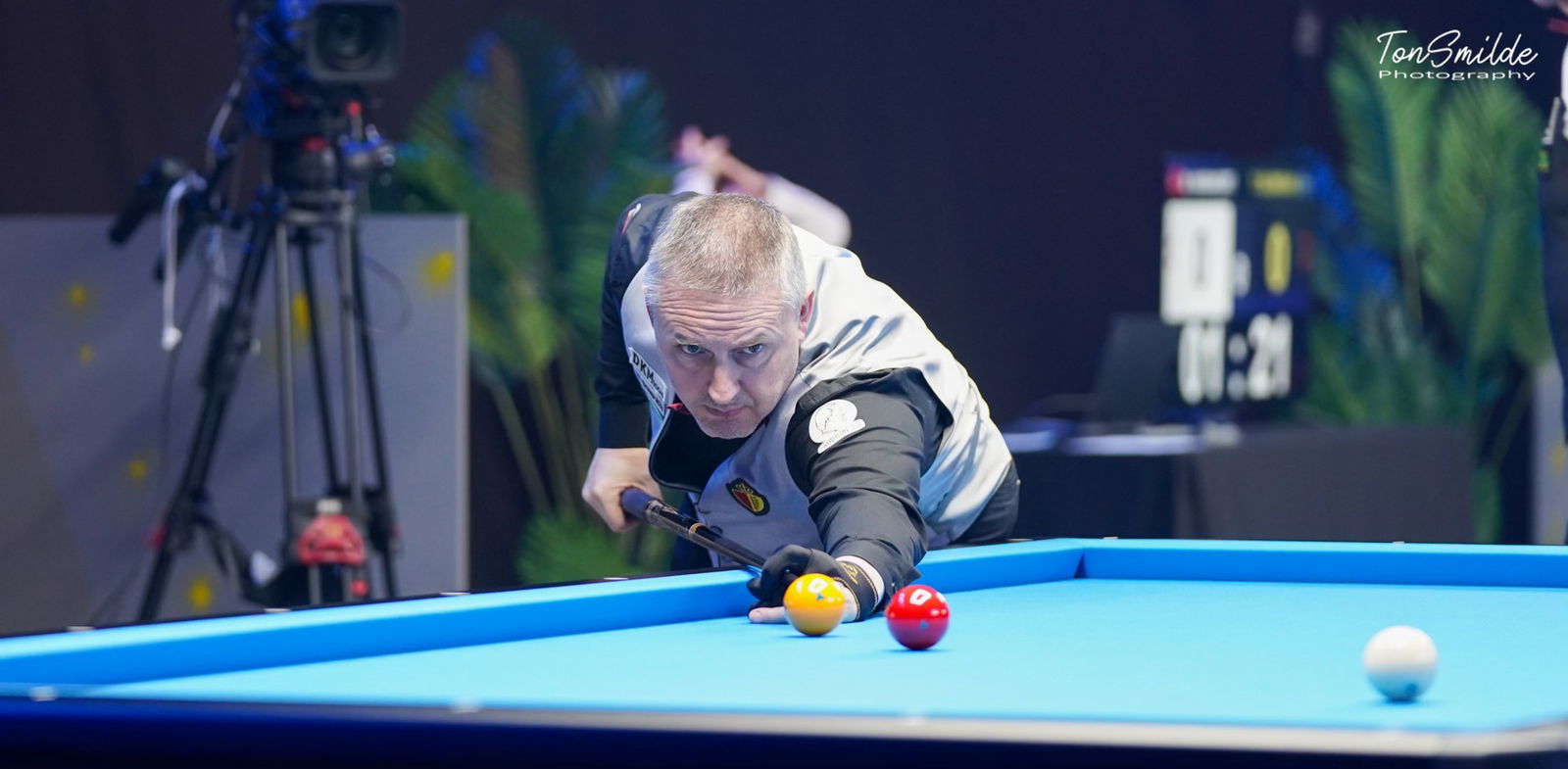 LINT/ANTWERPEN – Het beste van de dag was net voorbij gekomen in de partij van Jérémy Bury. De vooral veel Belgische toeschouwers op de tribunes, meestal ook supporters van Peter Ceulemans, de thuisspeler, keken gefascineerd naar een andere matchtafel, waar zich een ware thriller afspeelde. Peter Ceulemans knokte voor zijn thuispubliek, dat ademloos toekeek voor zijn laatste kans om te overleven in een gevecht tegen de Deen Thomas Andersen. De ooo’s en de aaa’s vlogen het publiek om de oren, de ene gemiste matchbal volgde op de andere. De wedstrijd ging naar de apotheose op 39-39, allebei één carambole van kwalificatie. Het was in het zenuwenspel uiteindelijk de Deen die scoorde en het zo belangrijke ticket voor de knock-outs veroverde. Het applaus was ook voor Peter Ceulemans, die na een drietje op het eind de matchbal had gemist door een klos. Maar de uitschakeling, zo dicht bij de overleving, deed heel veel pijn. Vooral bij de speler, maar zeker ook bij de meelevende toeschouwers.