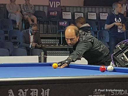 Dani Sánchez was in de halve finale een klasse beter dan Sameh Sidhom, die geen moment kon dreigen in de eenrichtingspartij. De Spanjaard nam al snel afstand (20-9 in de pauze na 12 beurten), liep uit naar 31-11 in 16 en bekroonde de partij in de 25e beurt: 40-16, moyennes 1.600 en 0.640.
